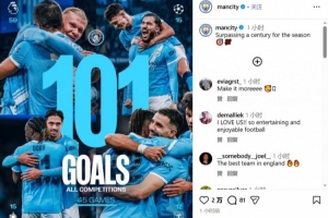 体育资讯3月10日讯 本赛季到目前为止,曼城各项赛事总计踢了45场比赛,已经打进101粒进球,俱乐部官方也晒出海报,庆祝本赛季进球破百。