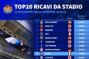 上赛季俱乐部球场门票收入:皇马2.33亿欧最多,曼联、阿森纳前三